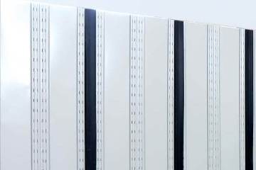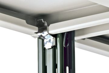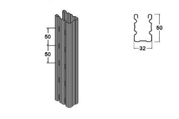 Stalpii sunt realizati din otel certificat S 235JR si au fante pentru fixarea politelor la un pas de 50 mm pe verticala.